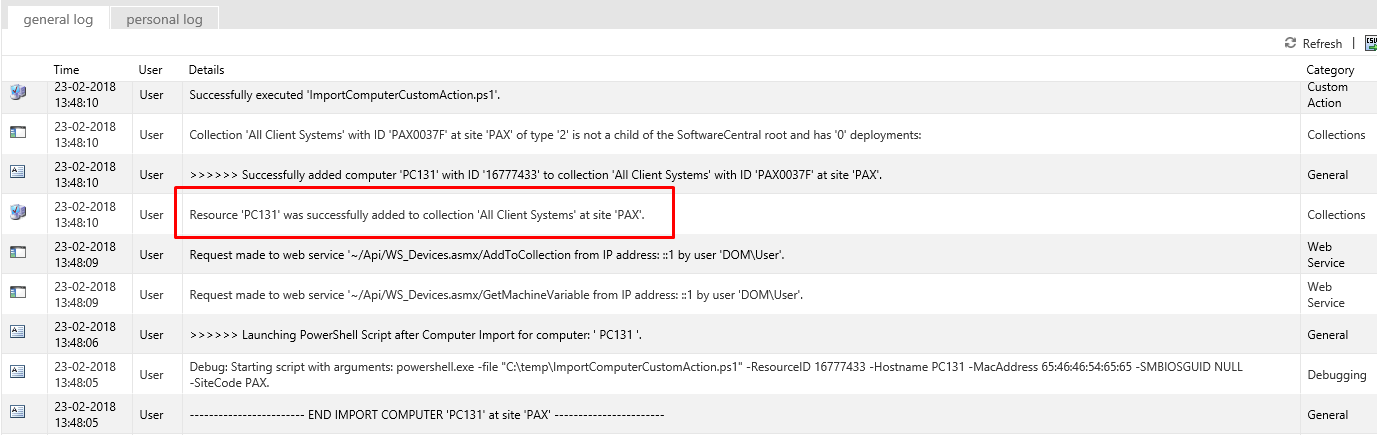 You will now see in the SoftwareCentral log, after the computer has been imported, that it is added to the selected collection: