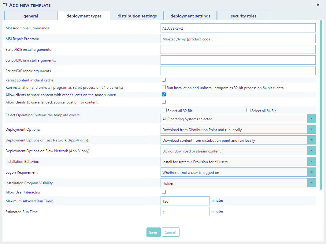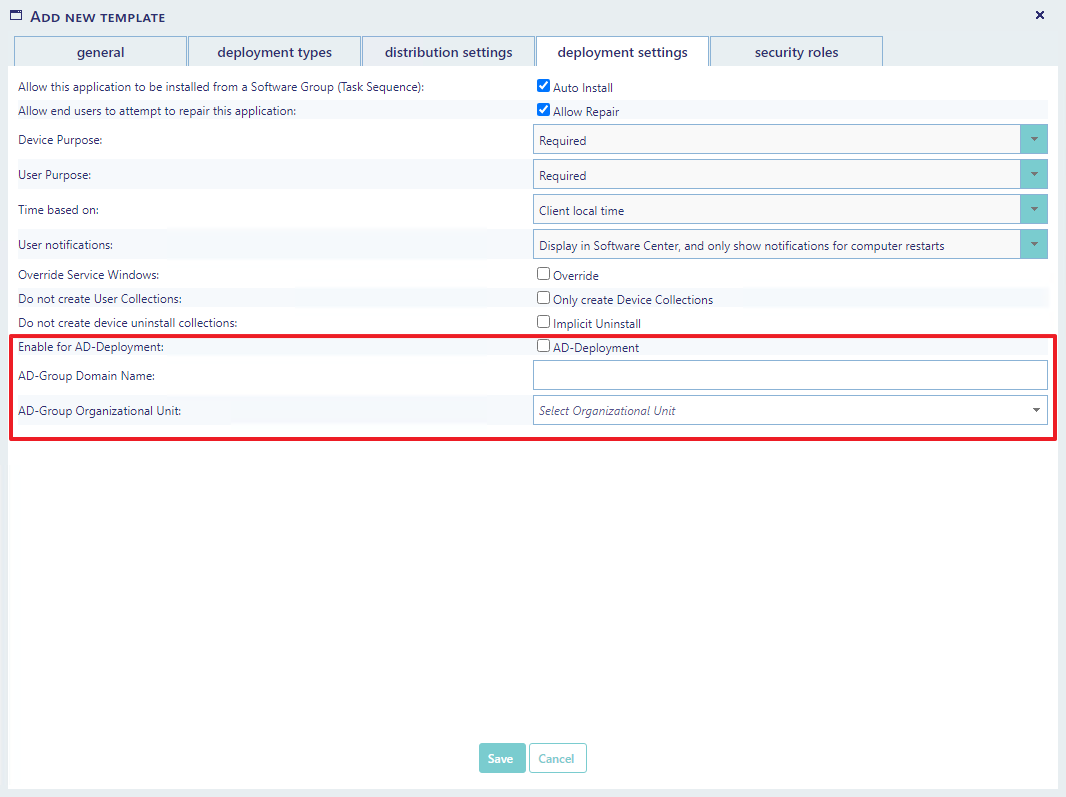 The third tab contains settings for distribution. More specifically it allows setting up distribution points, distribution point groups, SCCM application folder, and download rules of the content and MECM security scopes.