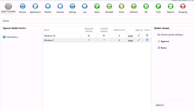 If some or more of the patches have failed, the update service can be run again, this is done by clicking the rerun button, this will move the service to the right side on the menu.