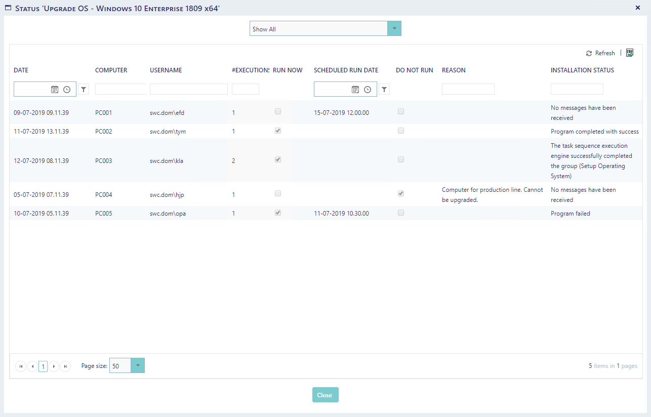 Click on the "Status" button to open the status window. From here, you will see a list of all devices, the current deployment is deployed to. Use the drop-down box on top of the gridview or the textboxes on top of each column to filter the results.