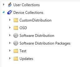 Notice that some of the folders have a SoftwareCentral icon. These folders are the SoftwareCentral distribution root folders. This is where collections are placed when you import applications and packages in SoftwareCentral. It is not recommended to change folders or collections under these folders. |
