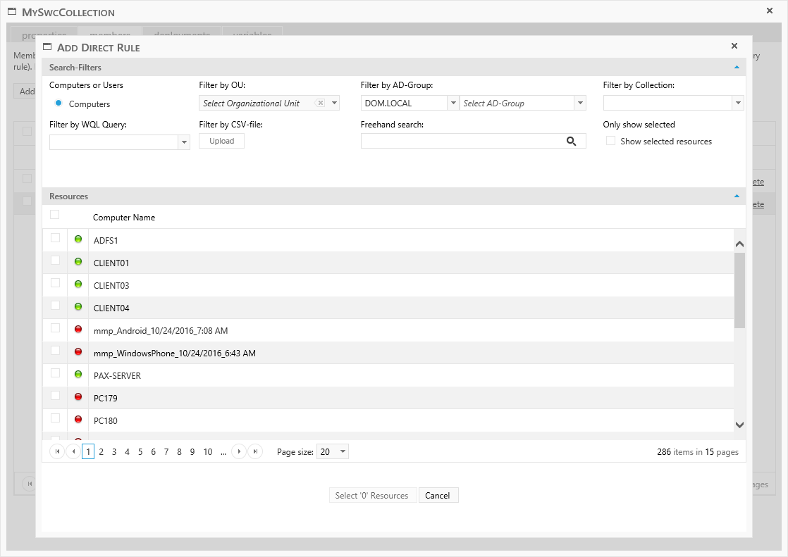 To add a direct membership rule, click on the "Add Direct Rule" button. A new window will open where you can select the resources you want to add to the collection.