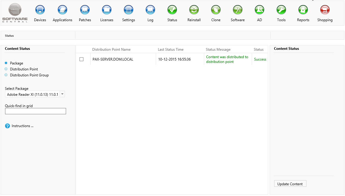 SoftwareCentral provides the ability to check and update the content for packages and applications on all distributions points and distribution point groups. This function is only available in the SCCM 2012 version of SoftwareCentral.