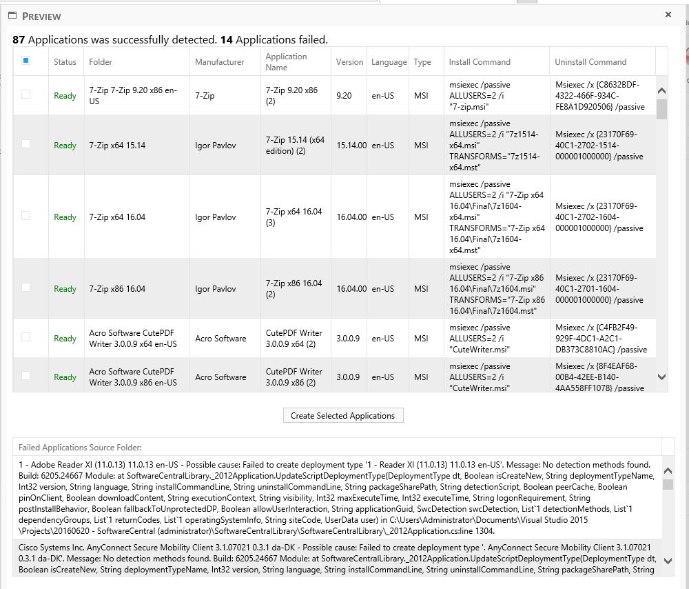 The check boxes to the left allows you to select which applications should be created in the SCCM when you click “Create Applications”. Note that no applications are selected by default.