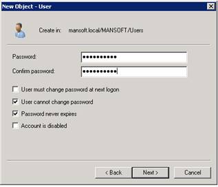 Remove check mark in ”User must change password at next logon”