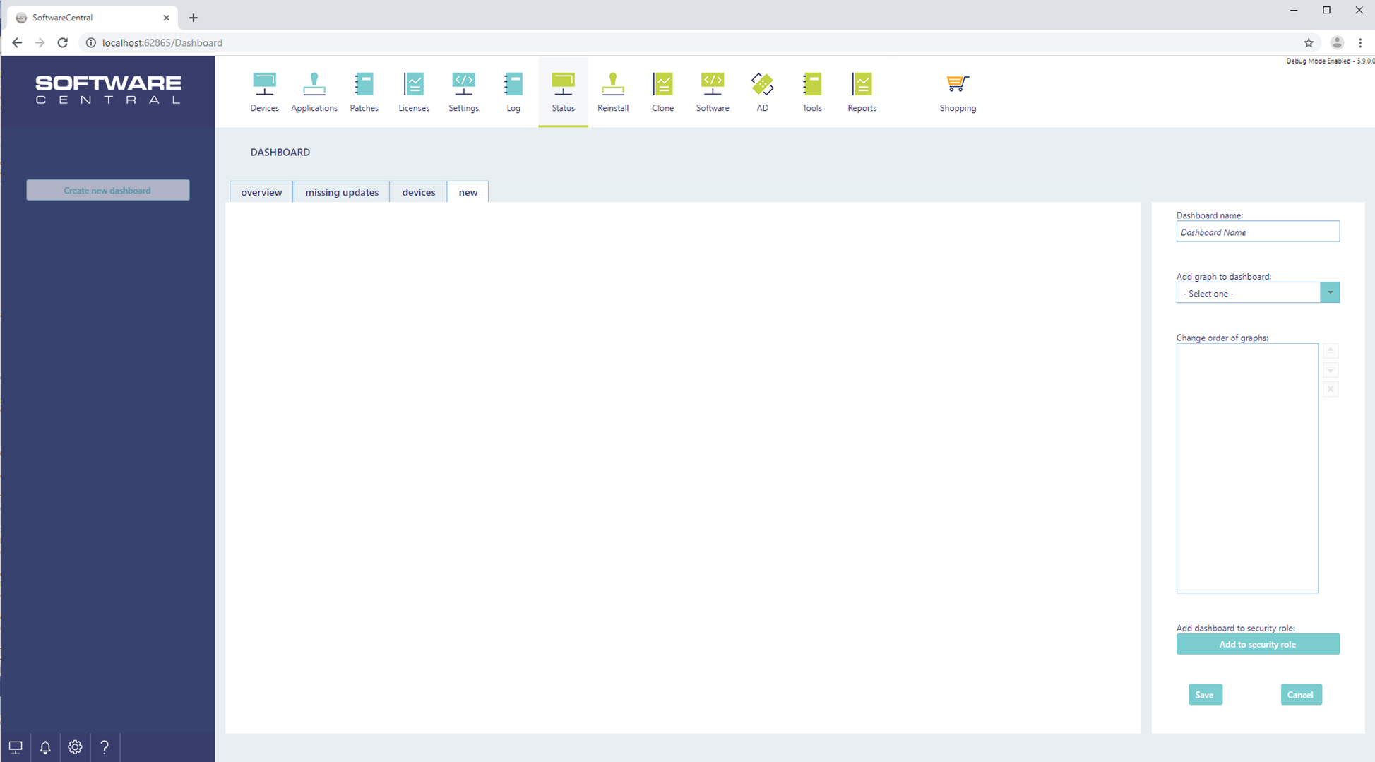 SoftwareCentral dashboard is an interface where a graphical representation of some data can be seen, to easy get an overview on how a specific status is, there is over 20 different types of graphs that can be added, and each have a detailed view where data for the element can be exported as a CSV file for further investigation.