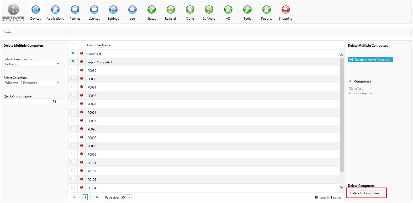In the right menu, you have a list of the computers you have selected. You can also see the amount of selected computers in the "Delete" button in the lower right hand side corner.