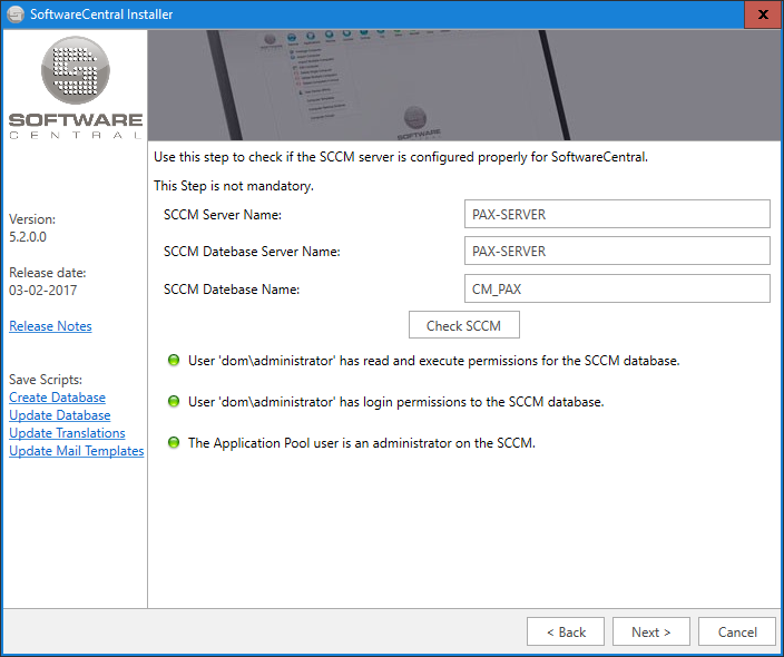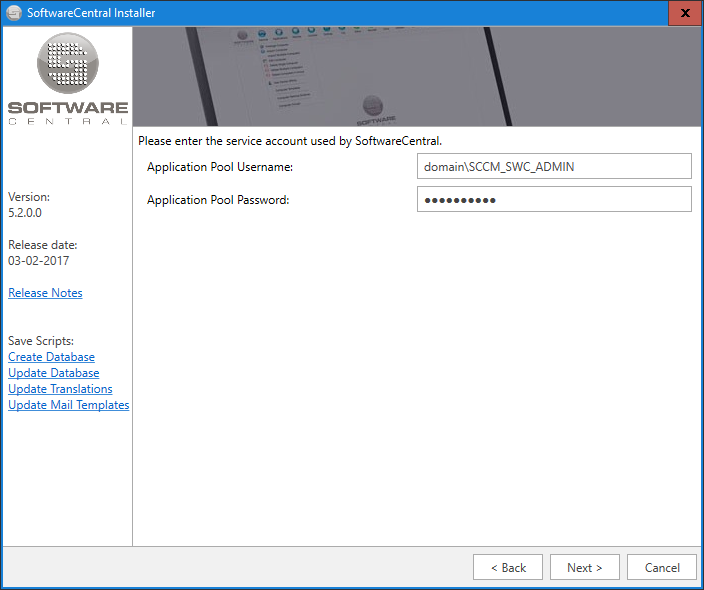 The installer must be launched with an account which have administrative permissions on the web server and full access to the SoftwareCentral database. |