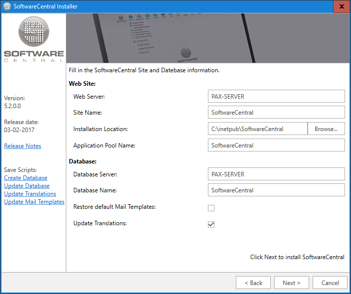 In the next step you must fill in the SoftwareCentral web site and database information.