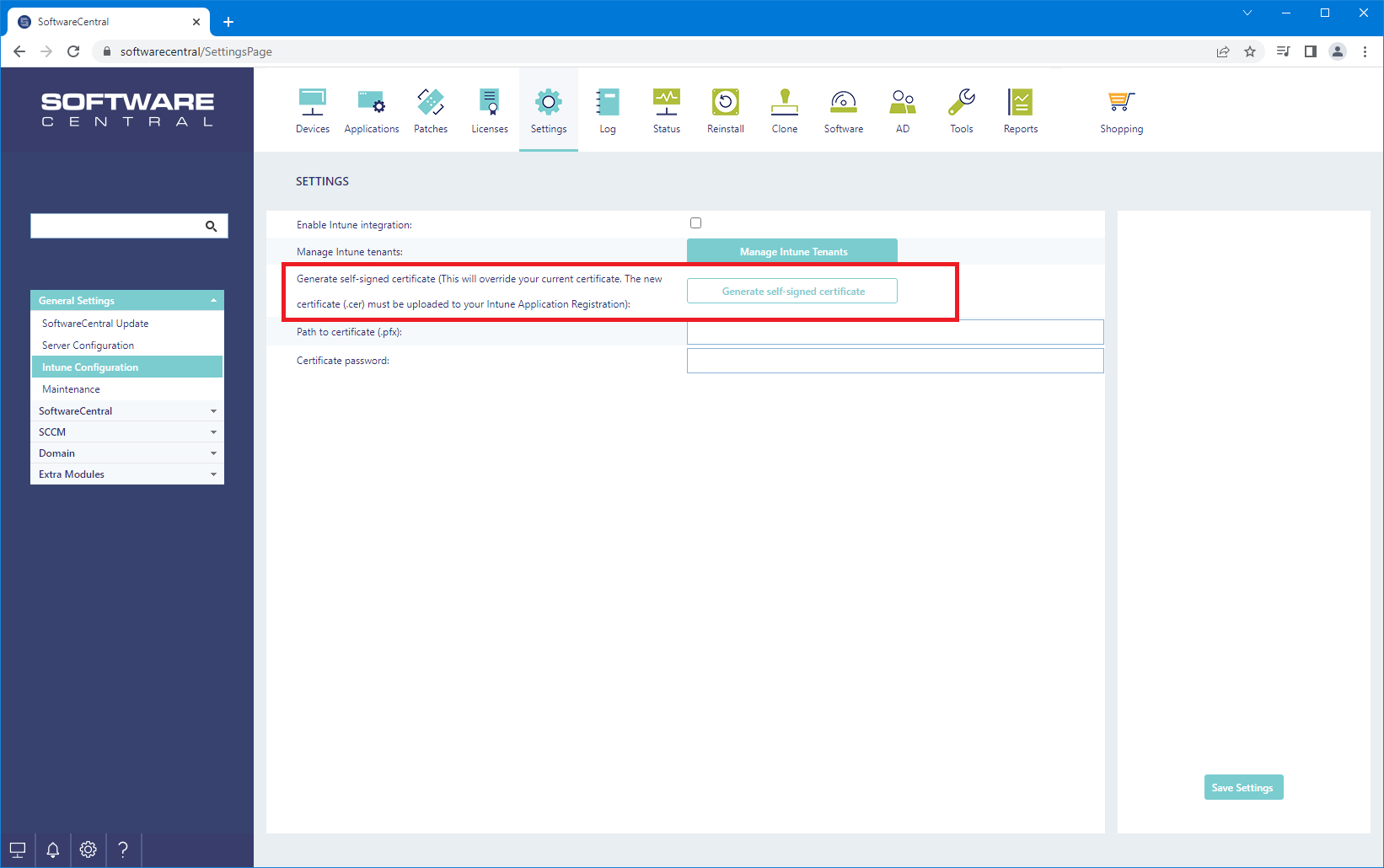 SoftwareCentral can create a self-signed certificate from Settings -> Settings -> General Settings -> Intune Configuration -> Generate self-signed certificate.