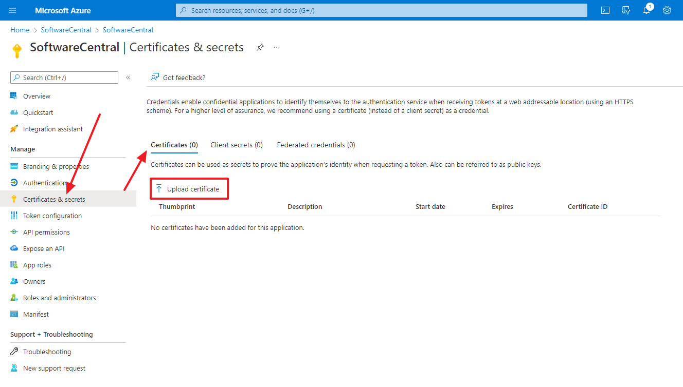 Next you must go to "Certificates and secrets" and upload the .cer file: