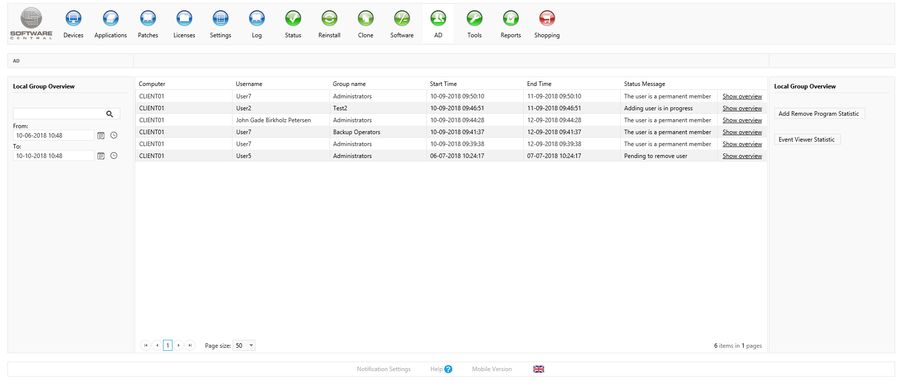 The local group overview interface is a part of the AD-module in SoftwareCentral and gives an overview over which programs that have been installed and/or uninstalled during the membership of the local group.