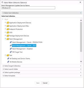 Each update service must have a name; this name is added to the top of the window in the naming text. Next a test collection is selected, this collection is used to automatic deploy the patches to, this must consist of a small representation of the devices that the patches is target to. The window will show all collection in a tree form, and the desired collection can be browsed a selected.