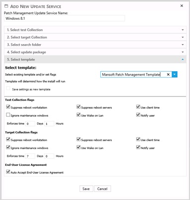 If none of the preexisting template live up to the desired requirement, a new one can be created by clicking “Save settings as new template”, a textbox will appear where the new name is entered. When the save button is pressed, the new template will also appear in the patch management template interface.