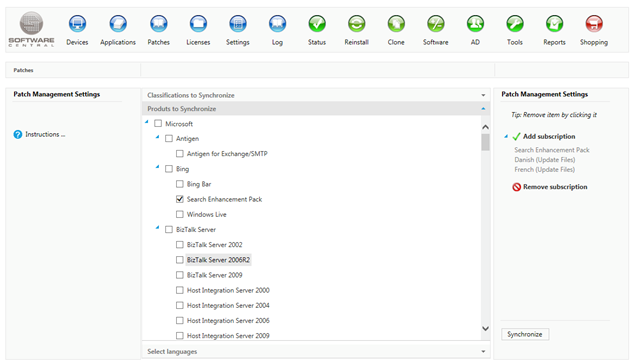 In the interfaces all the desired update classifications, products and language are selected or deselected in the three tabs. Each selecting will bring the object over to right side of the interface.