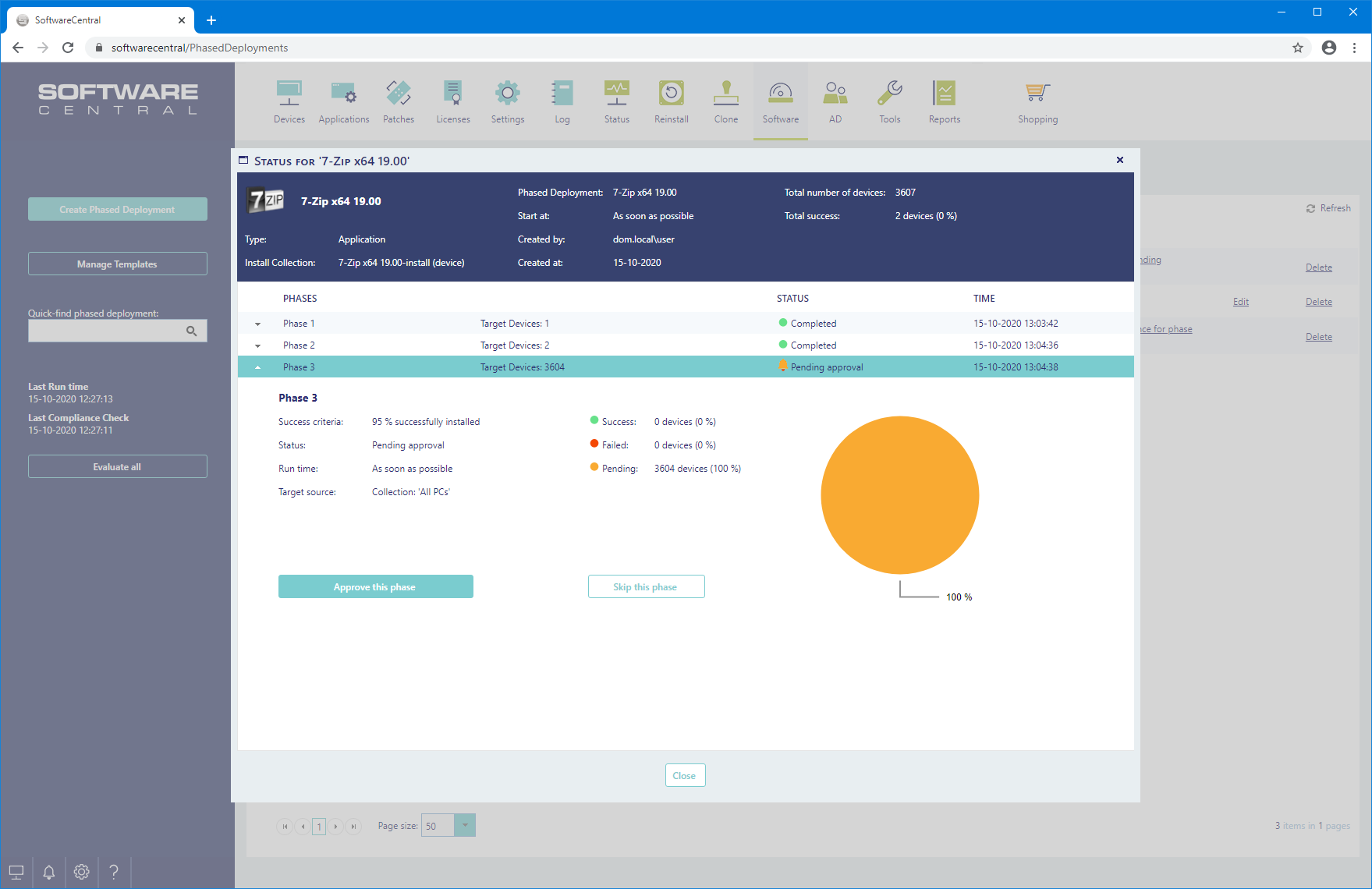 The View detailed status button will open a new window where you can see the installation status for each device in the phase.