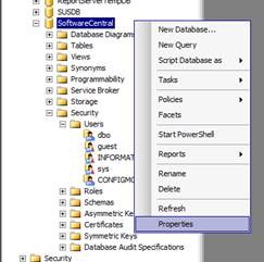 Locate the SoftwareCentral Database in the Databases folder. Right-Click it and choose “Properties” from the context-menu.