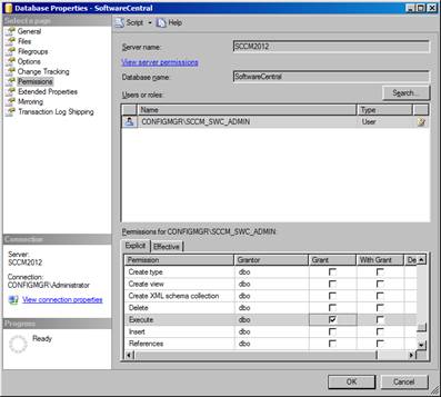 Choose Permissions and grant the SCCM_SWC_ADMIN database user Execute permissions on the SoftwareCentral database and click OK.