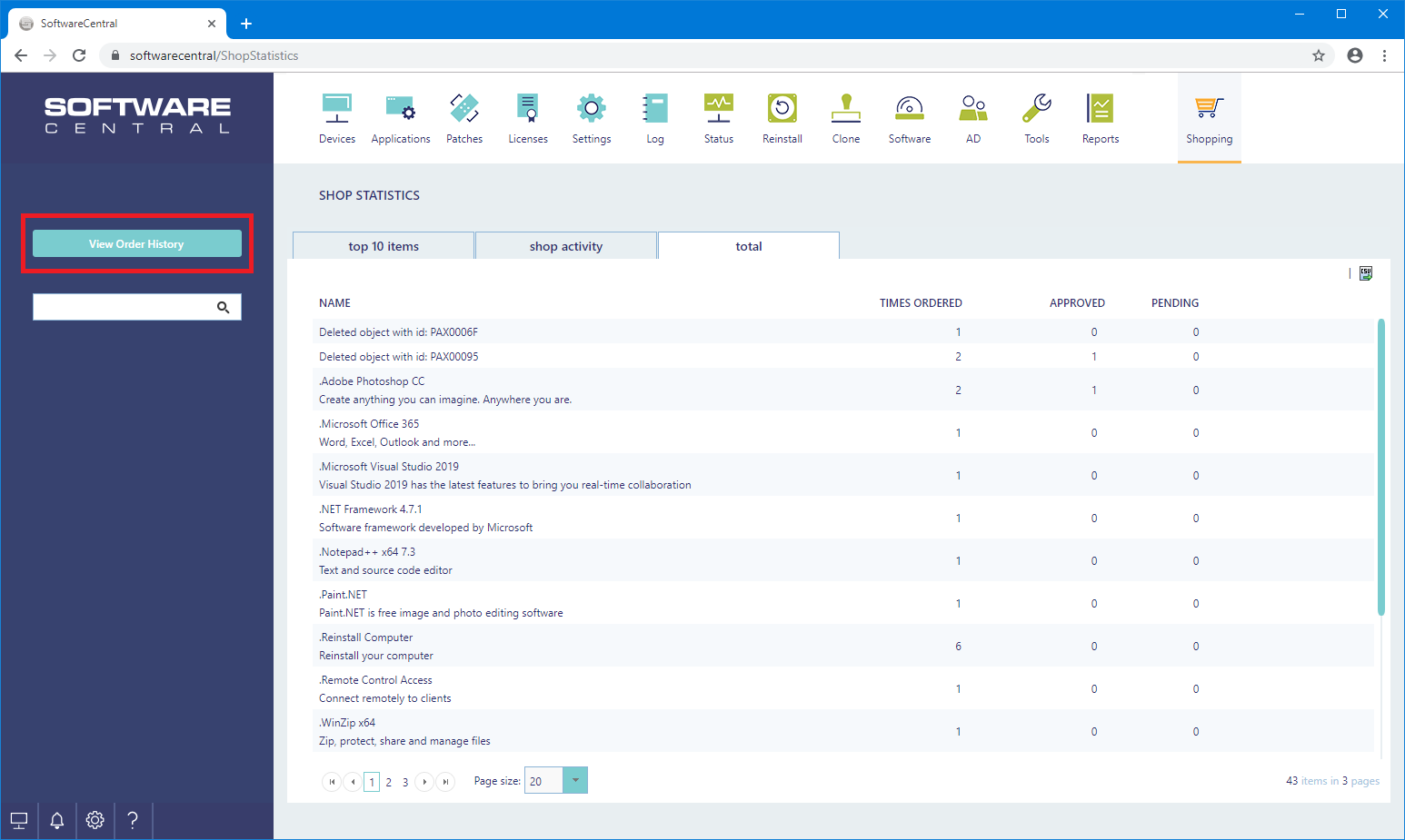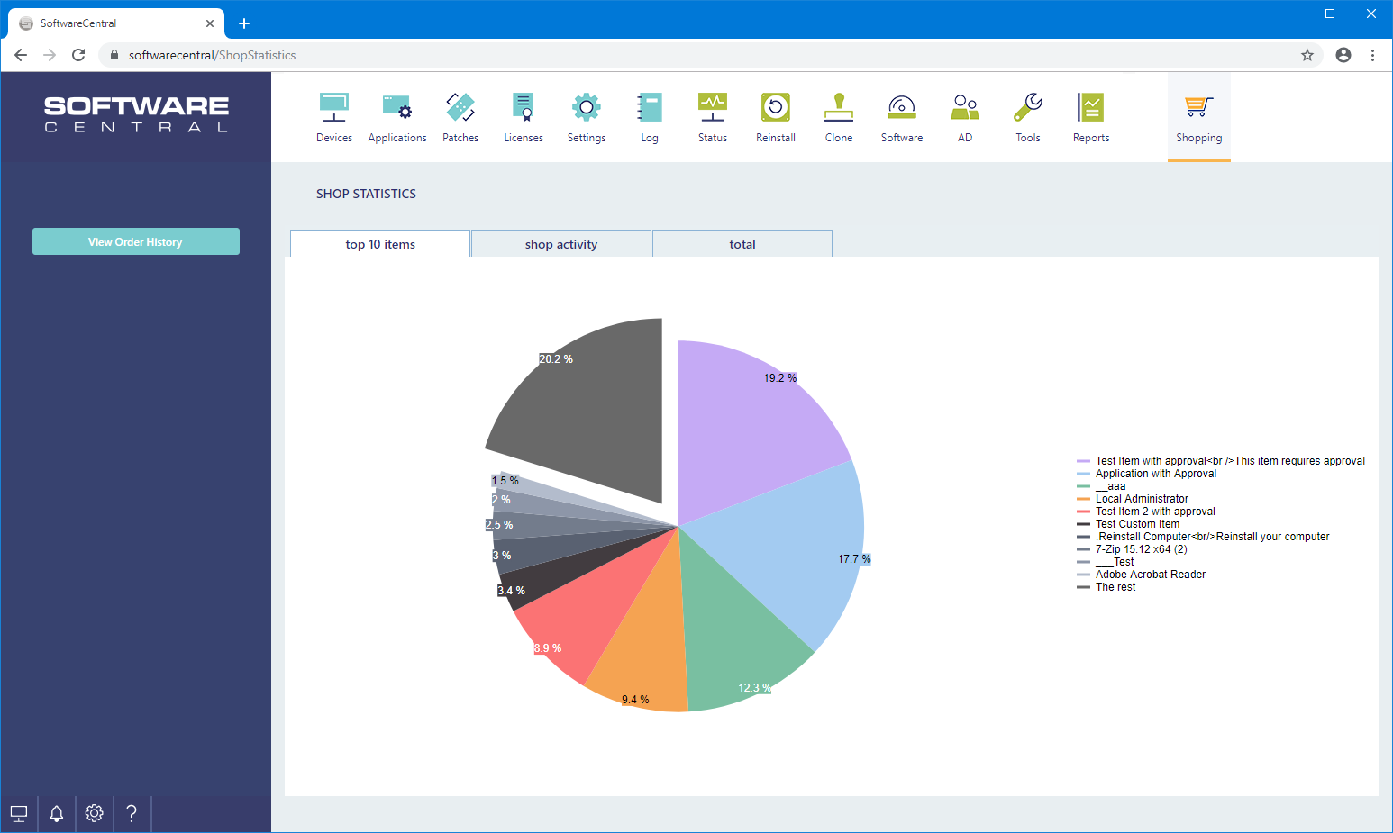 The Shop Statistics page gives a quick overview of items ordered in the shop and gives access to the order history. There are 3 types of statistics, top 10, activity and total.