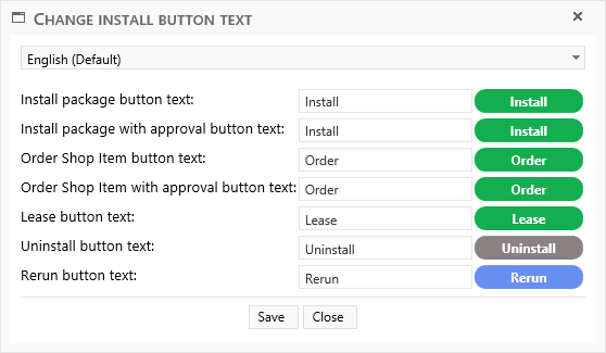 Change the text of the install / uninstall / rerun buttons in the shop. This button will open a new window, where you can also see a preview of your new text. Note that the length of the button is fixed, so you cannot make the text to long.