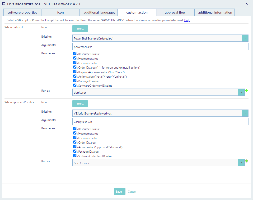 Custom Action can add a custom action to the package. This can be useful if you want to run a script when the package is ordered and / or reviewed. You can for instance configure it to grant permission to a share that is needed for the package or to add order details to another management system, e.g. ServiceNow or Remedy.