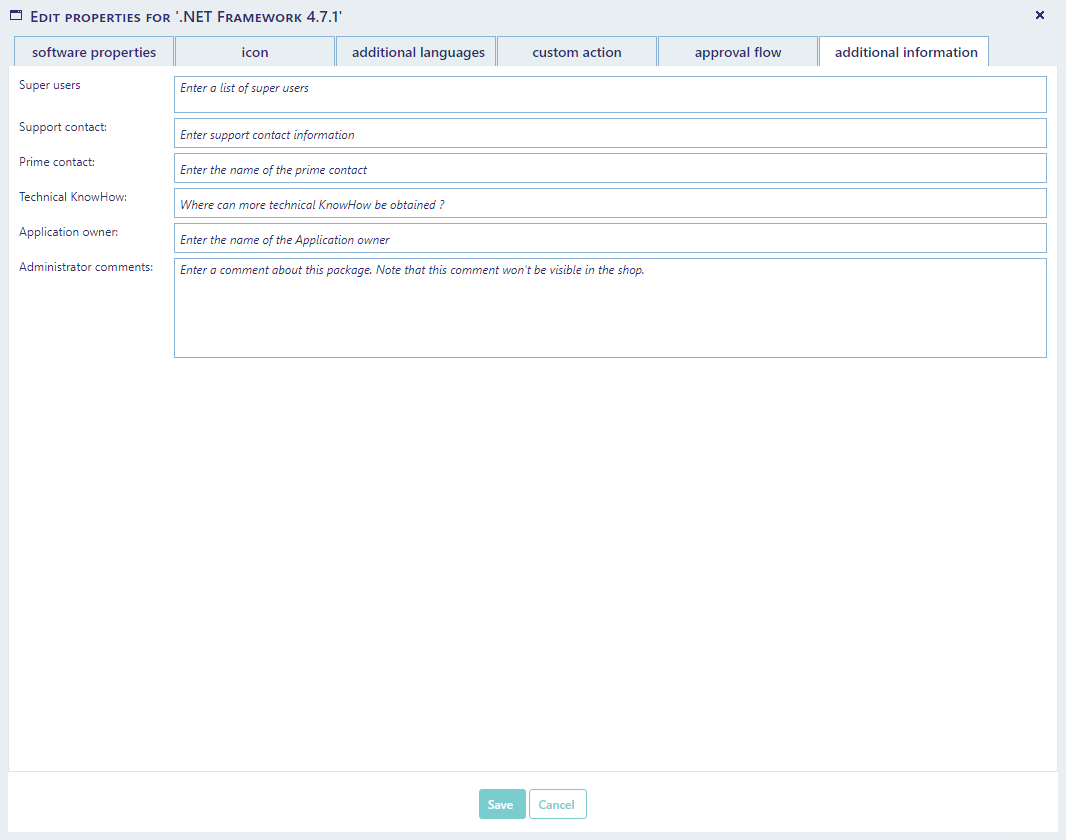 Software Variables: can be used to ask the user for additional information before the packages is ordered. A software variable can be a textbox for custom input or a drop-down-box with predefined values. See the chapter Software Variables for information on how to create Software Variables.