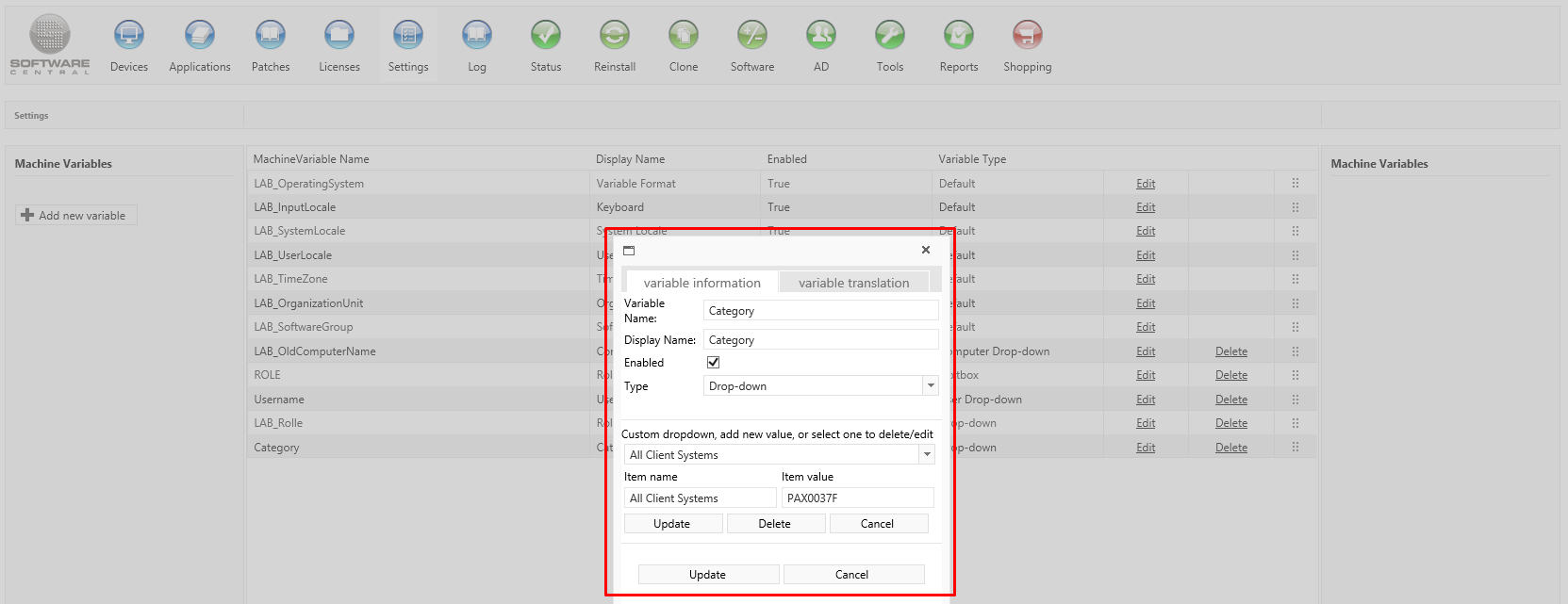 We will move the "Category" variable to the top of the Import Computer interface, using the Machine Variables interface: