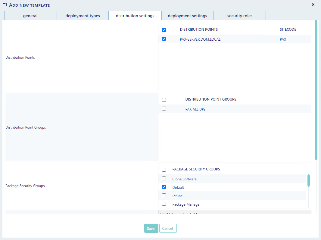 The third tab contains settings for distribution. More specifically it allows setting up distribution points, distribution point groups, SCCM application folder, and download rules of the content and MECM security scopes.
