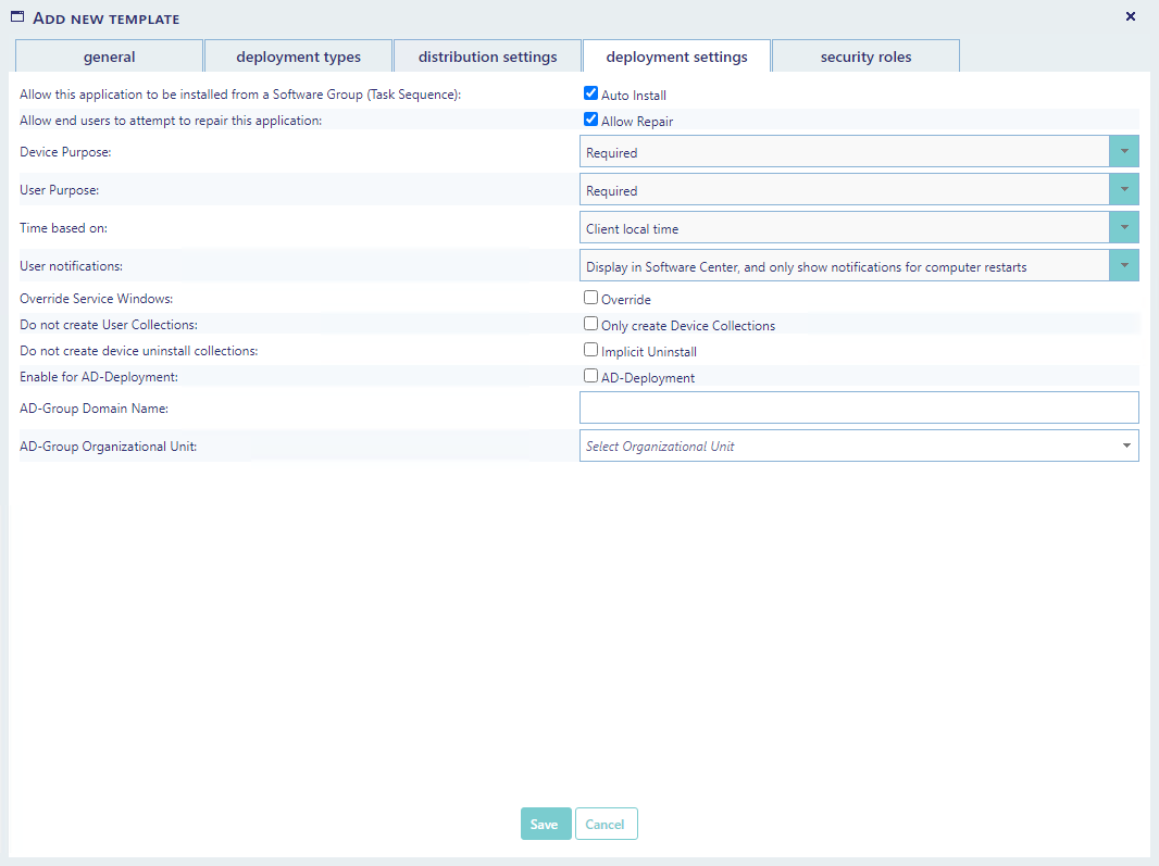 When you have finished adjusting the settings to fit your needs, then click the save button to save your work. The newly created application template will now appear in the list of templates. Or click cancel to return to the list view without committing the inputted data.