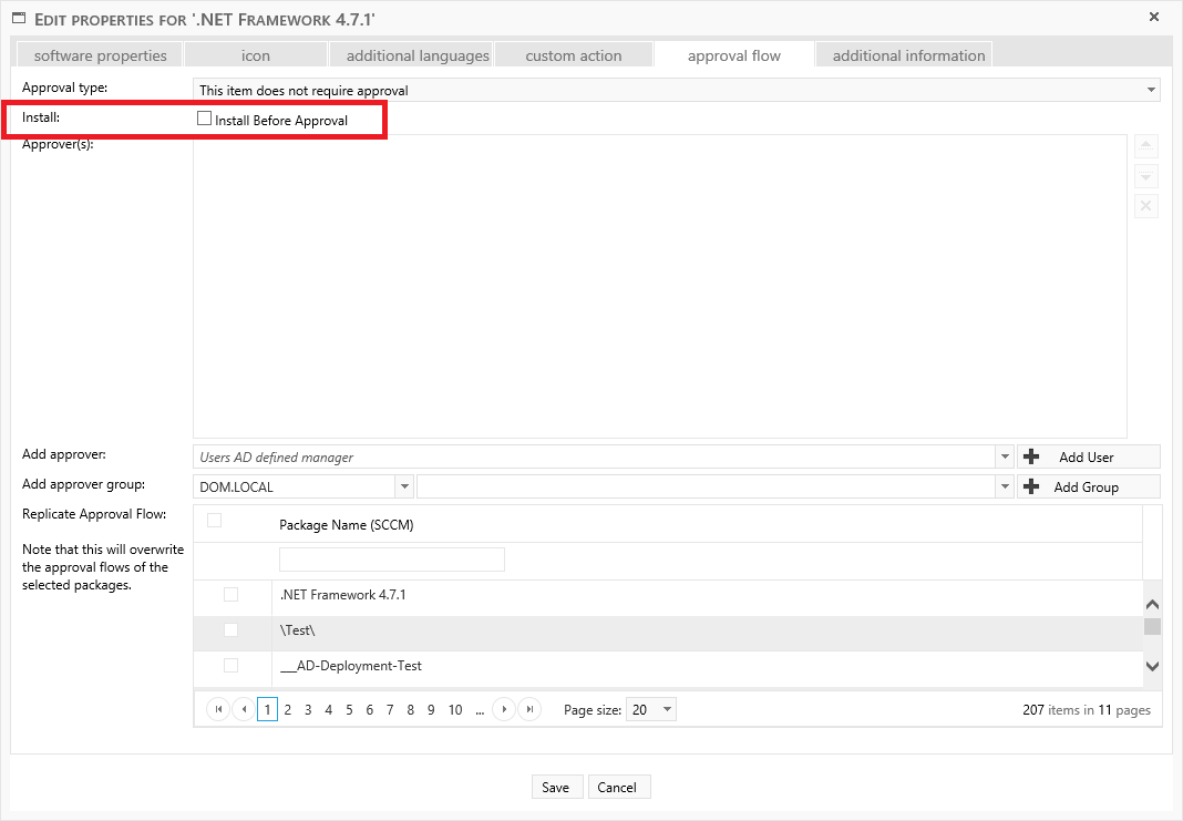 For packages and application you can set the "Install before approval" flag.