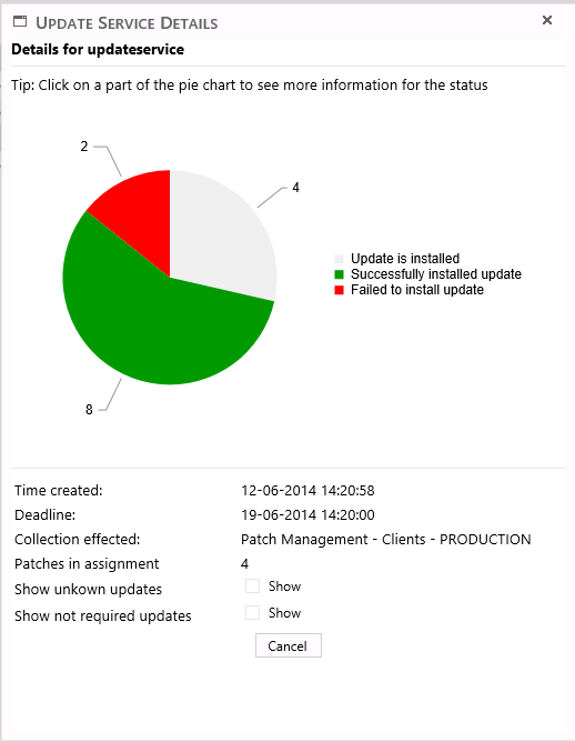 This window provides a graphical representation of the deployment, and will show how many patches is in each status. Patches which status is unknown or patches that is not required is automatically not showed. But can be added to the graph, by clicking on the checkboxes under the graph.