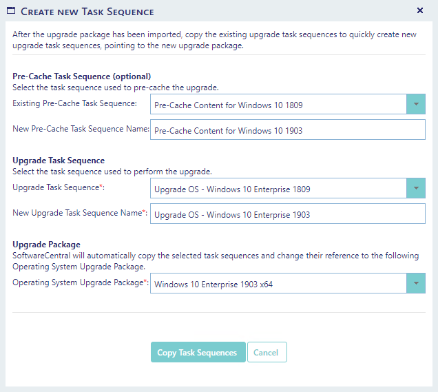 A new window will open. From the new window, select the previous used pre-cache and upgrade task sequences. Name the new task sequences. Finally select the new Operating System Upgrade Package.