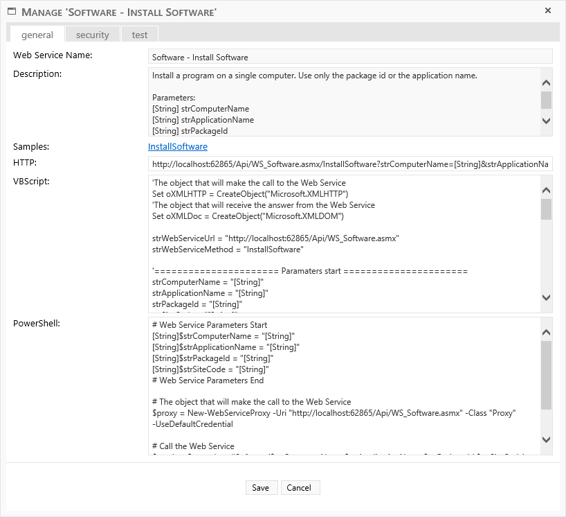 The VbScript textbox contains an example on how to call the web service from a VBScript.