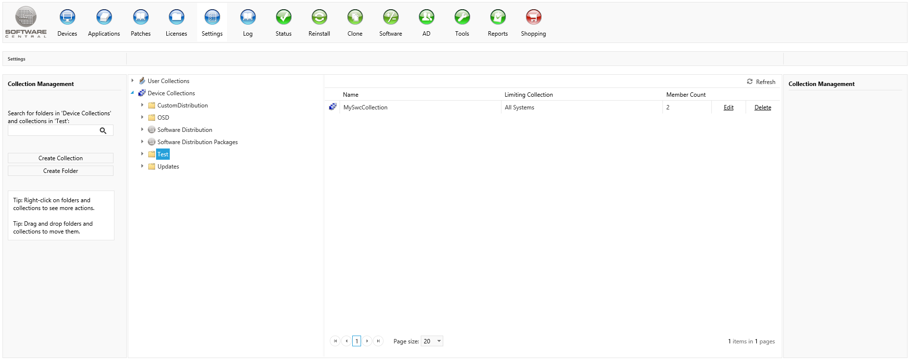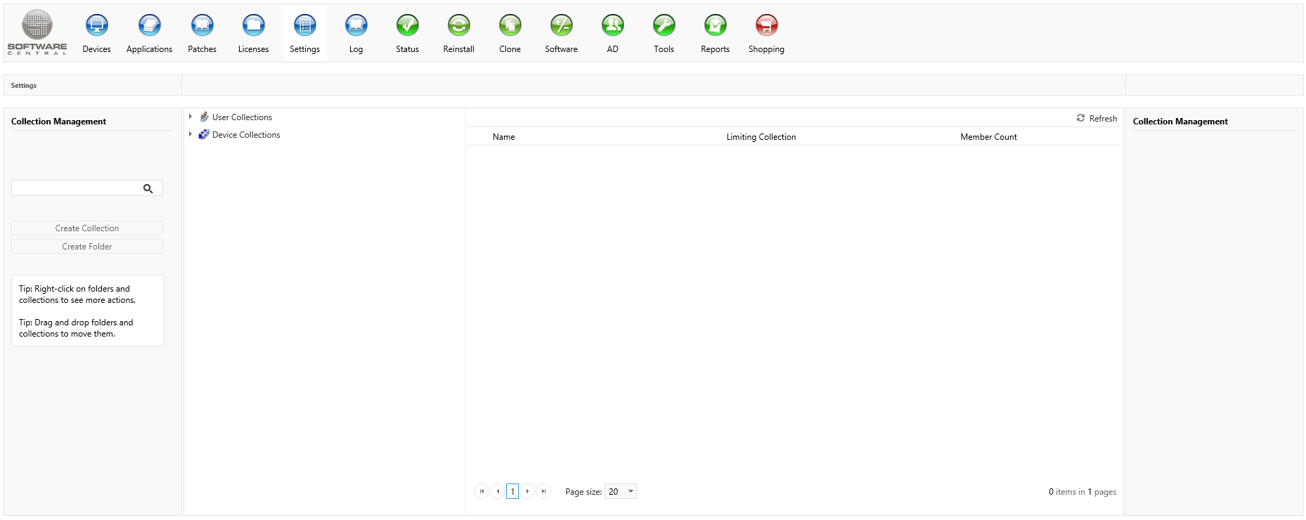 From the Collection Management interface, you can manage SCCM collections and their members. The interface is found under the Settings menu: