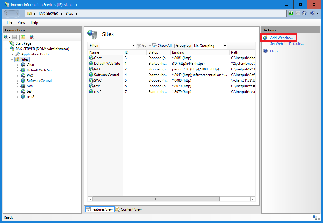 Open the IIS Manager and go to the Sites tab. Click on "Add Website...":