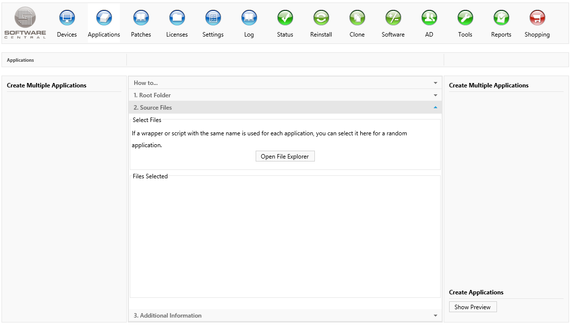 SoftwareCentral is now ready to process the files and show a preview. If your MSI files are standardized with a special name, you can give SoftwareCentral an example application in “2. Source Files”:
