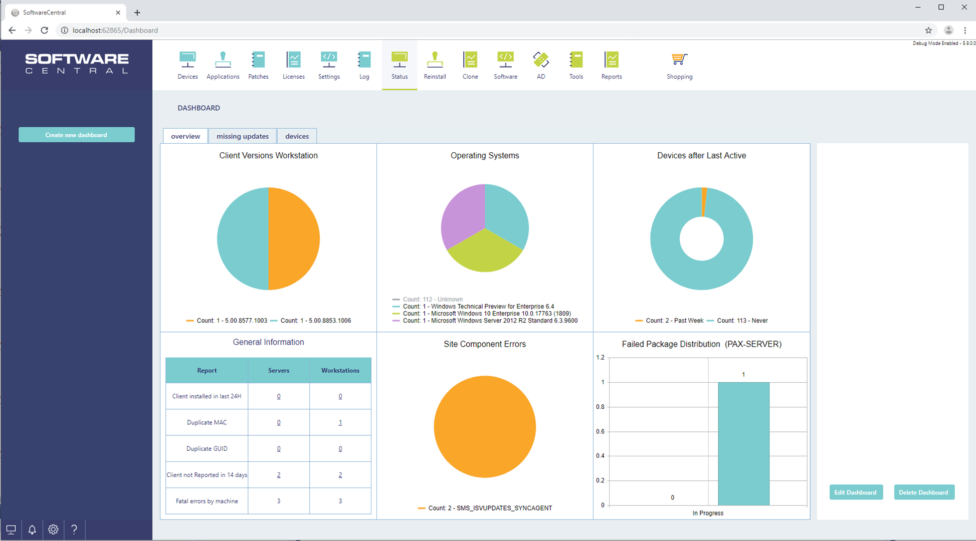 SoftwareCentral dashboard is an interface where a graphical representation of some data can be seen, to easy get an overview on how a specific status is, there is over 20 different types of graphs that can be added, and each have a detailed view where data for the element can be exported as a CSV file for further investigation.