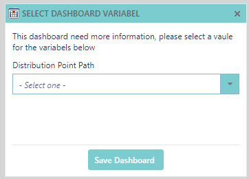 Some dashboard needs additional information before it can be added to a dashboard, when this is the case a small window will open where the dashboard variable value is selected, and “Save Dashboard” is pressed to add the item.