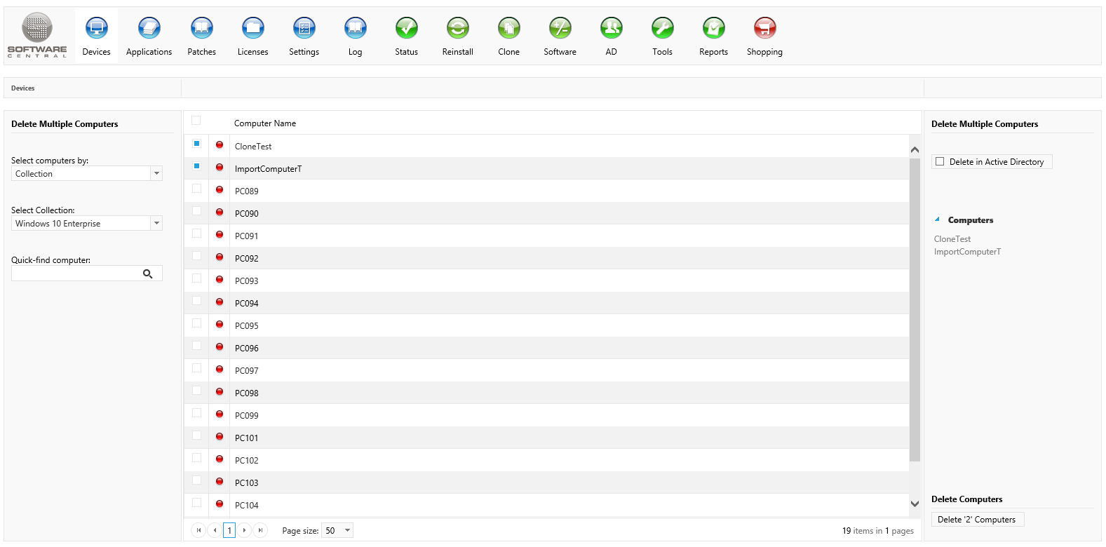 In the right menu, you have a list of the computers you have selected. You can also see the amount of selected computers in the "Delete" button in the lower right hand side corner.