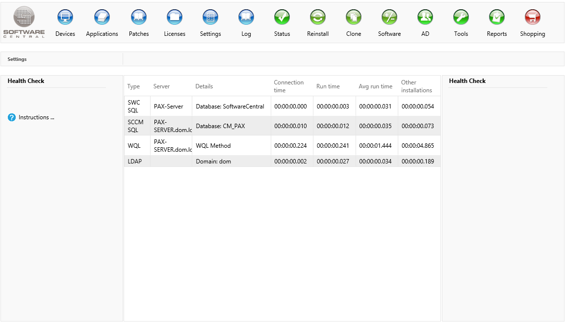 The Health Check interface can be used to quickly determine if there are any connection issues between SoftwareCentral and the SCCM servers and Domain Controllers.