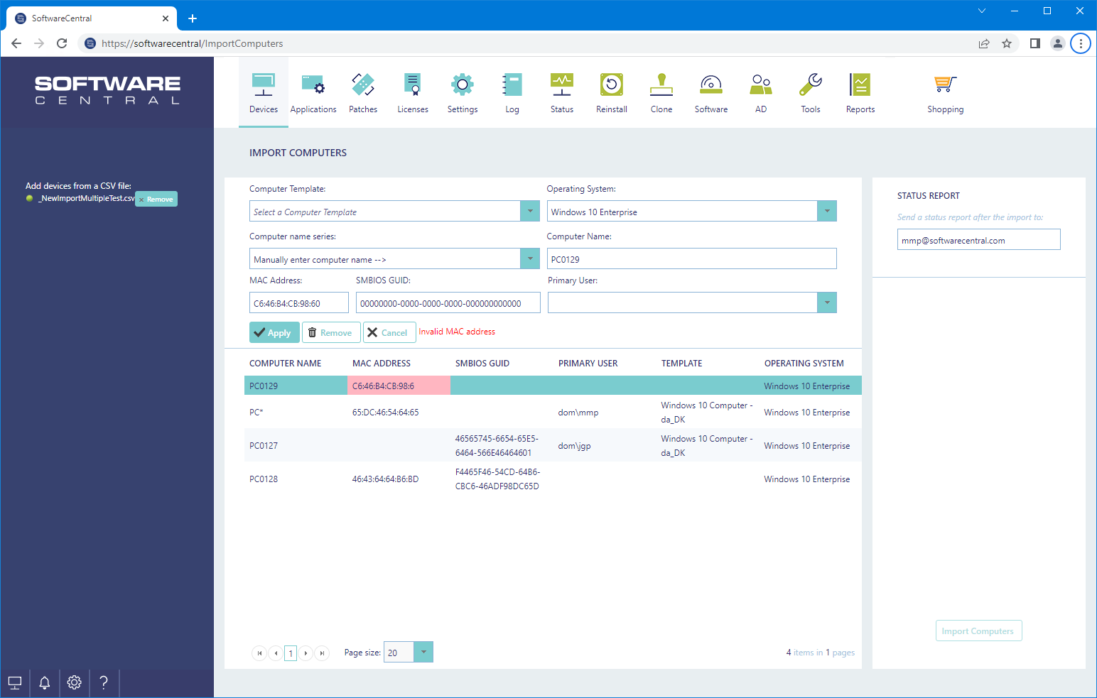 Use the select button in the left menu to browse to the CSV file or drag and drop the CSV file over it. The computers from the CSV file will then be displayed in the interface. Any errors with the computers will be highlighted.