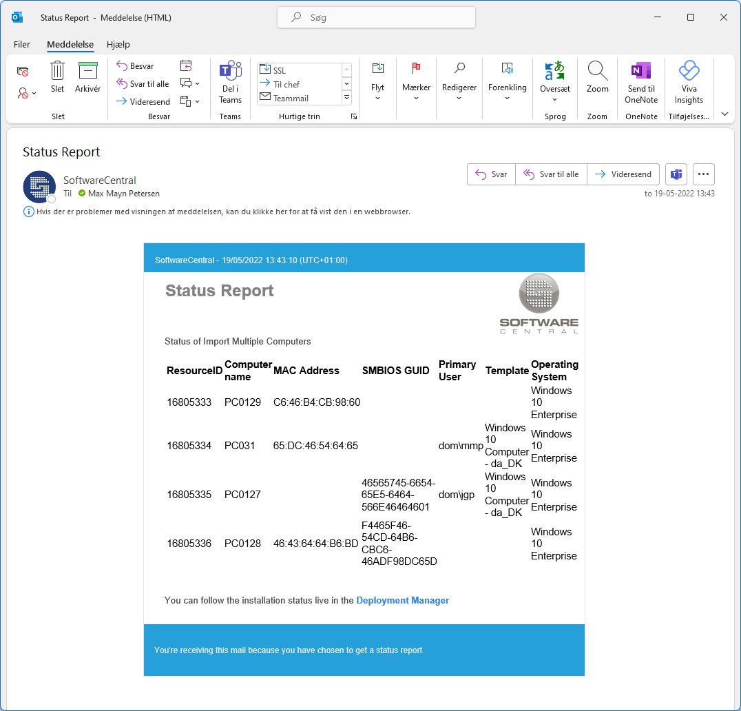 You can get a status report send to your mail-address. This can be helpful to follow up on the status of the import and to match assigned computer names and resource ids to mac-addresses.