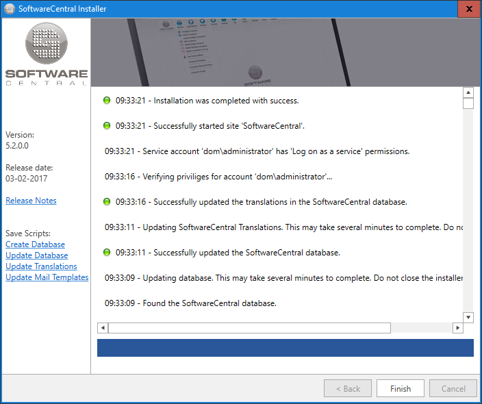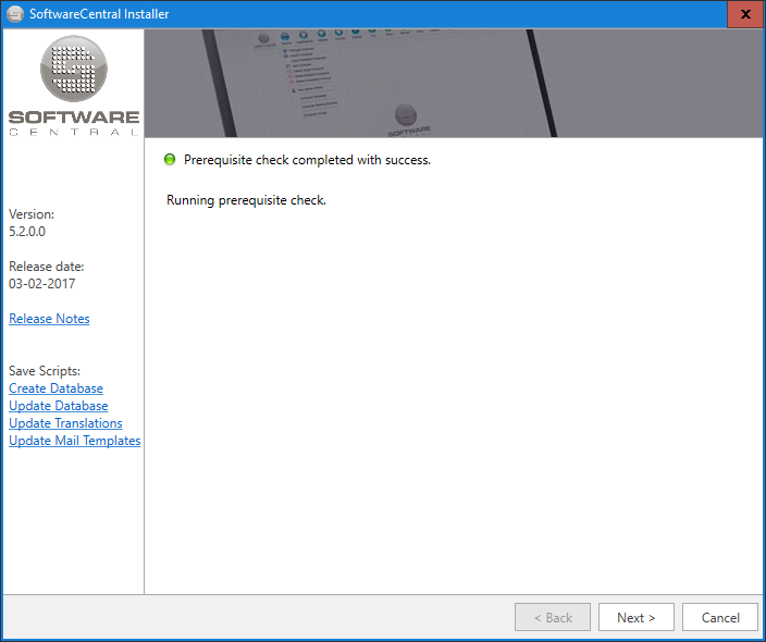 If the installer is unable to update the database, you can download the scripts from the left menu of the installer and run the script manually. See the chapter Updating the SoftwareCentral database for more information.