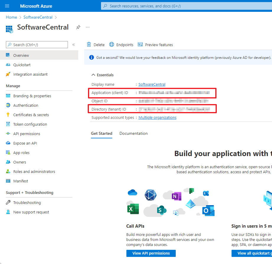 The Application Registration will now be created and opened. On the overview page, note the Application and Directory ID. They will be needed later during this setup.