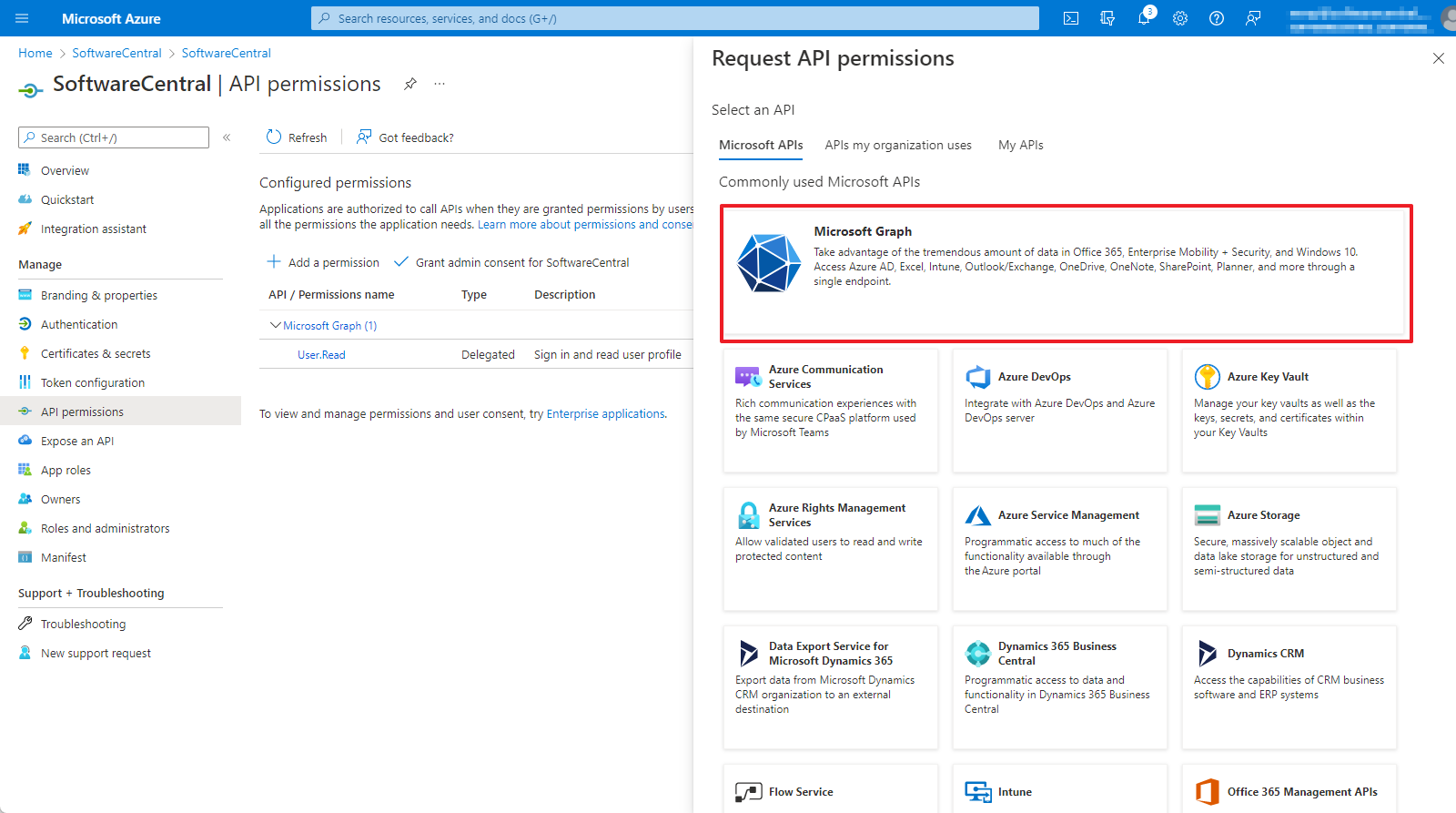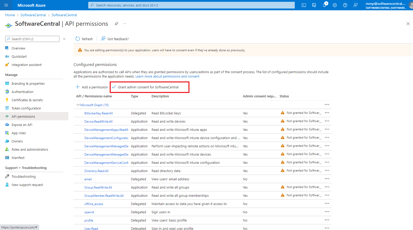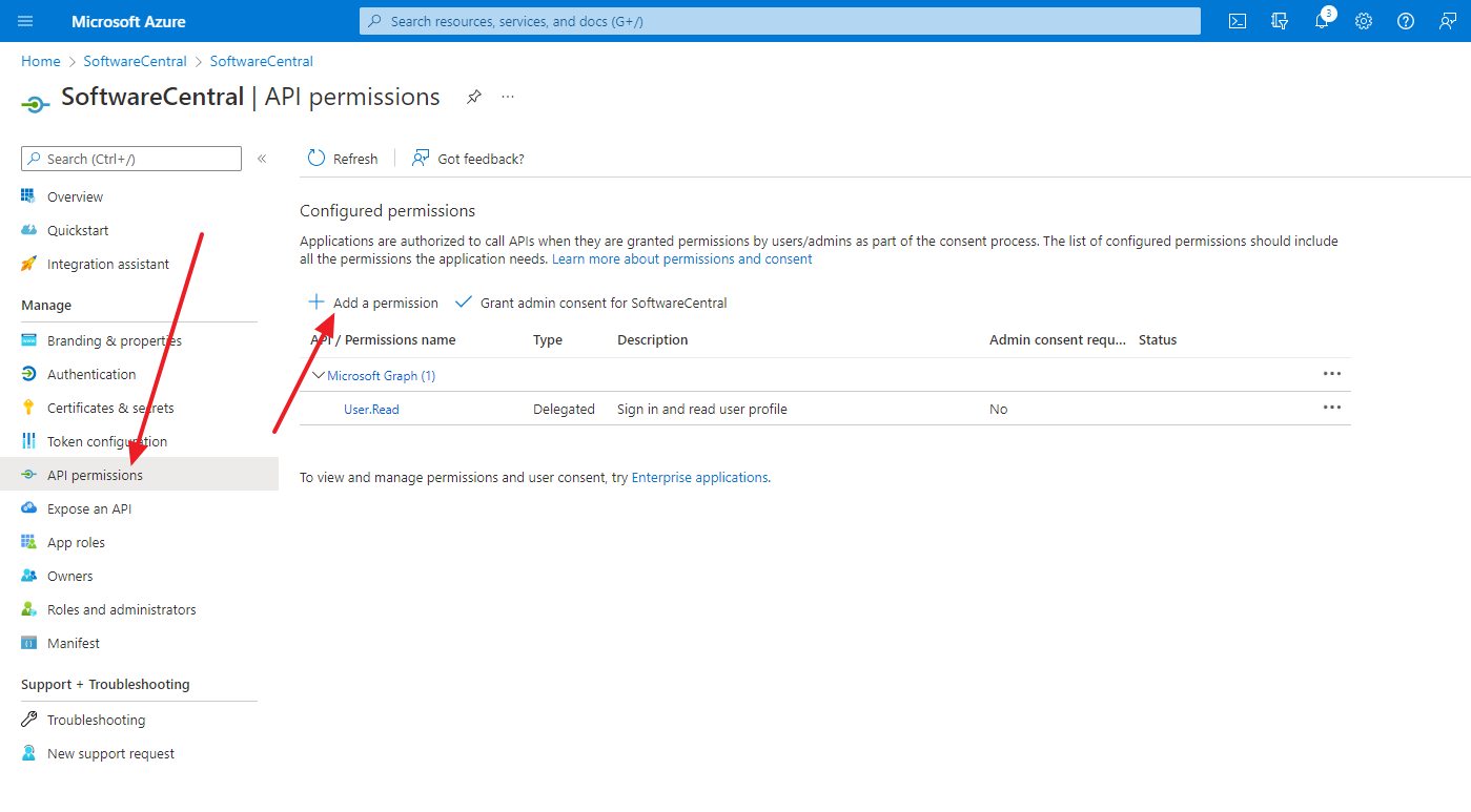 SoftwareCentral requires both delegated and application permissions.