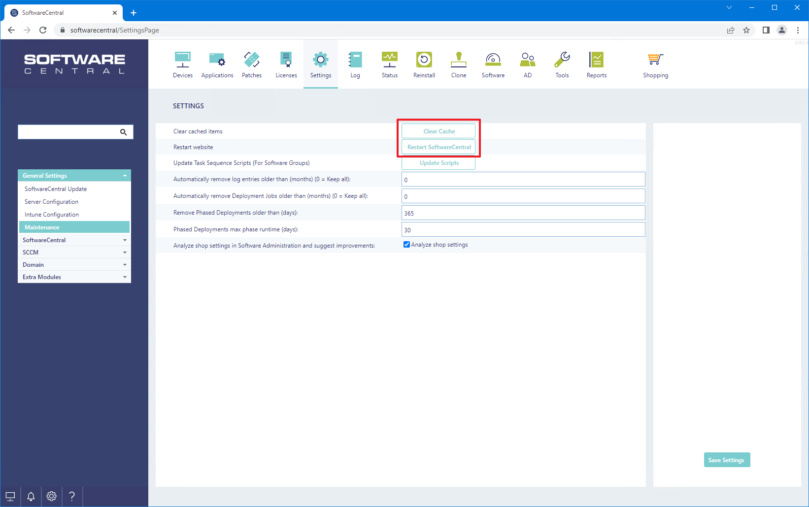 Finally, go to "Maintenance" and first click on "Clear Cache" and then "Restart SoftwareCentral".