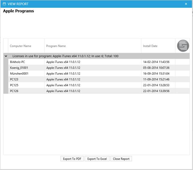 Shows license in use for all programs, in this report the program selection tab will not be showed.