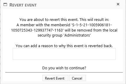 A reason to why this event is reverted can be added by the user, this reason will be visible in the change log. In the change log there will always be a message when a user tries to revert any events.