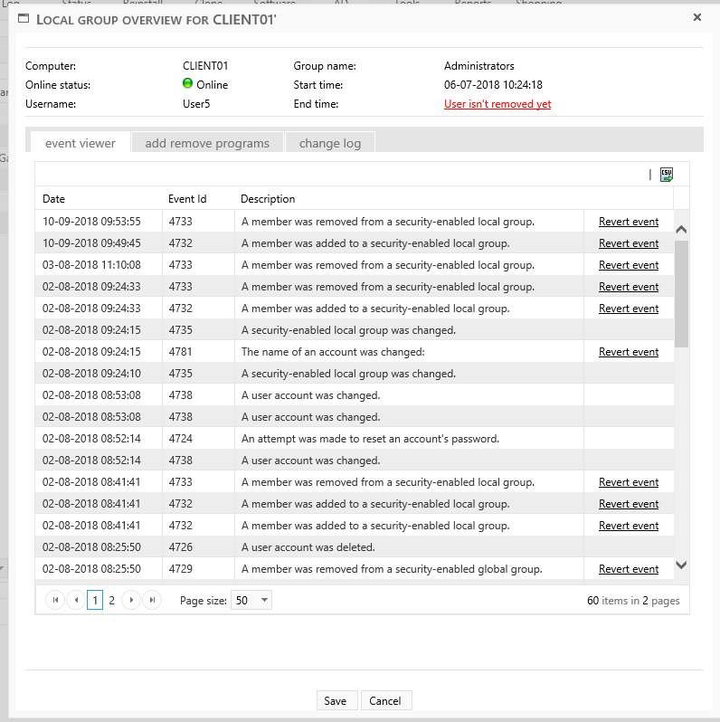 For completed jobs, SoftwareCentral will look in the Event Viewer on the computer if it is online and see if there are any events between the start and end of the local group membership period. These events will be stored, so they can be reverted if possible.