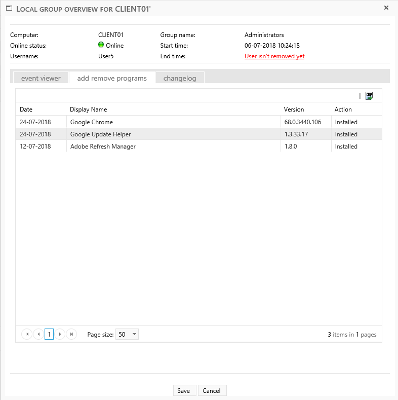 The local group overview interface is a part of the AD-module in SoftwareCentral and gives an overview over which programs that have been installed and/or uninstalled during the membership of the local group.